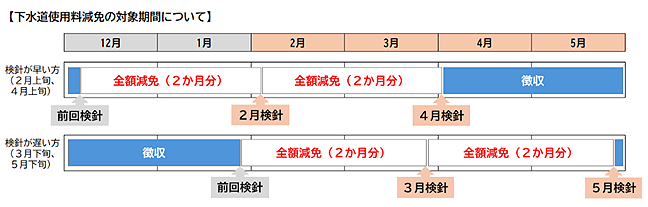 具体的には検針期間が令和8年2月~5月中の検針2回分の家庭用の下水道使用料が減免されます。