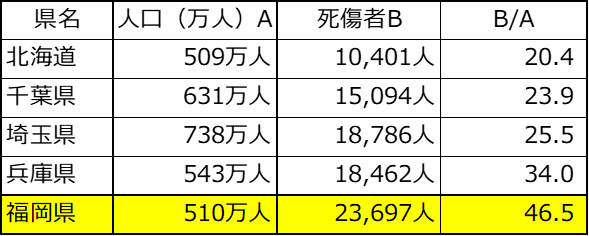 なお、表は福岡県と人口が同程度の都道府県の「令和6年の人口と死傷者数」を表にしたものですが、福岡県はその比率が一番高いという残念な結果になっています。