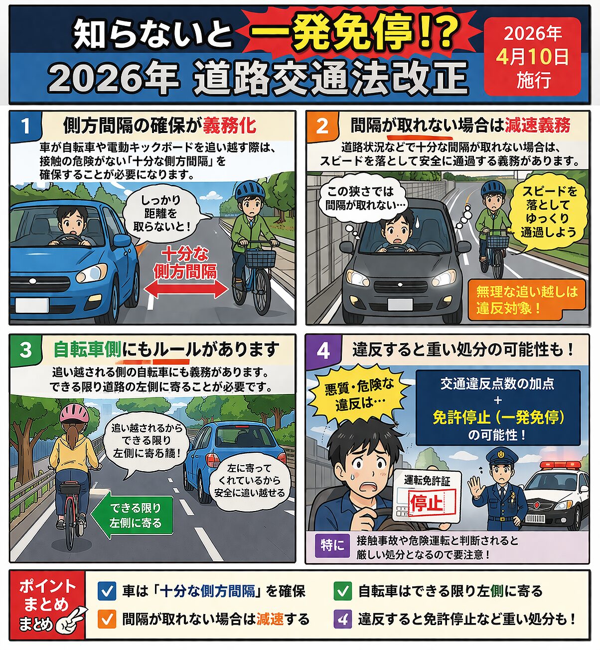 2026/4/10自動車と自転車の側方通過ルールの強化 2026年4月から自転車の右側を通過する際、接触の危険がない「十分な間隔」を取る必要があります。 車が自転車や電動キックボードを追い越す際、十分な側方間隔が取れない場合は減速義務が課されます。 また、追い抜かれる自転車もできる限り左による義務が課されます。